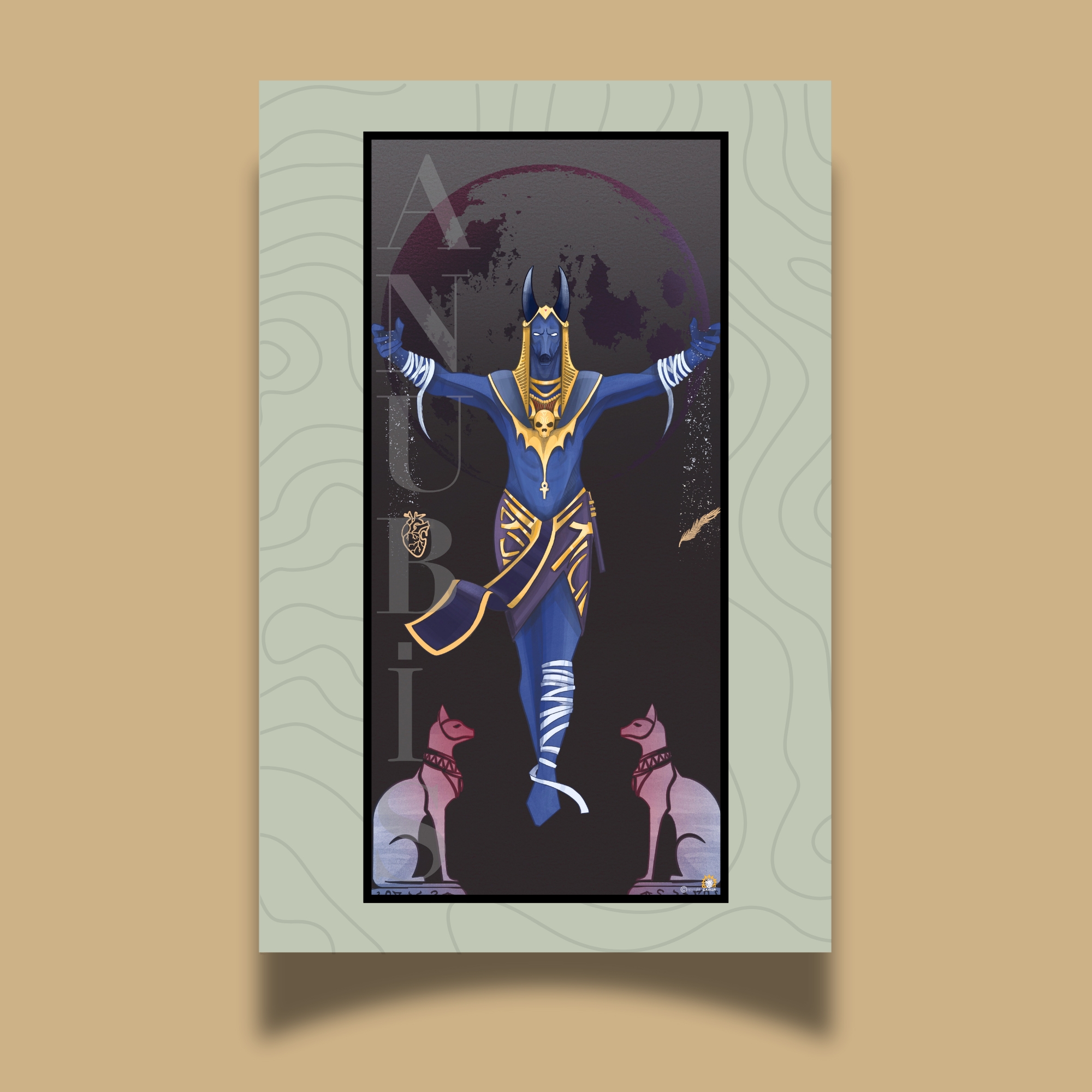 Bu özel tasarım poster, Anubis’in geceyle özdeşleşen güçlü duruşunu ve ruhani asaleti yansıtır. Altın detaylar, onun kutsallığını simgelerken; arka plandaki yıldızlar ölümsüzlükle olan bağını vurgular.